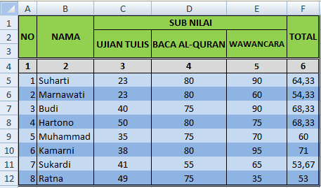 Untuk itu ada baiknya demi keakuratan data anda gunakan Fungsi AVERAGE dalam menetukan nilai rata-rata dari hasil ujian yang diikutsertakan oleh banyaknya peserta dengan banyaknya pula mata pelajaran yang diujikan dalam satu kompetensi baik itu ujian sekolah maupun tes penerimaan karyawan baru atau lain sebagainya.